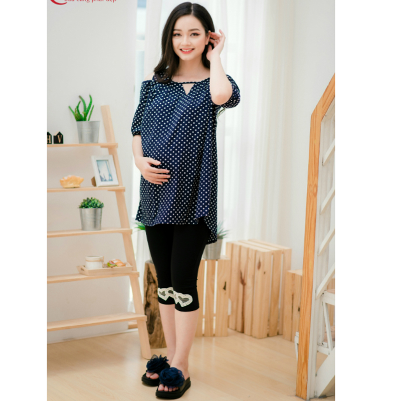 Áo bầu chấm bi khoét vai Emum (nhiều màu) với chất liệu lụa không bám dính da, sờ mát tay, không nhăn, luôn giữ form dáng trang phục khi mặc. Áo khoét vai, họa tiết chấm bi dễ thương, kết hợp form dáng cho bụng bầu tốt, mẹ có thể phối đồ đi chơi hoặc đi làm.