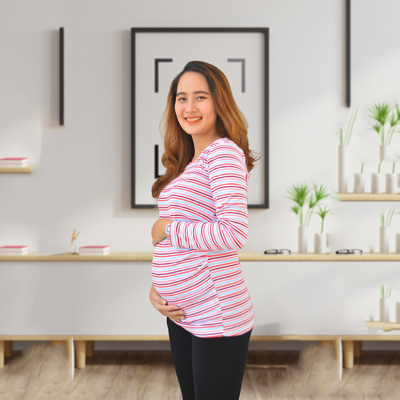 Áo bầu cổ tròn tay dài kẻ sọc Emum thiết kế dáng tay dài ấm áp luôn che chắn cơ thể tránh gió rét, họa tiết sọc ngang nhiều màu theo xu hướng mới nhất. Áo có thiết kế phần bụng có nhún khiến bụng bầu trông gọn hơn.