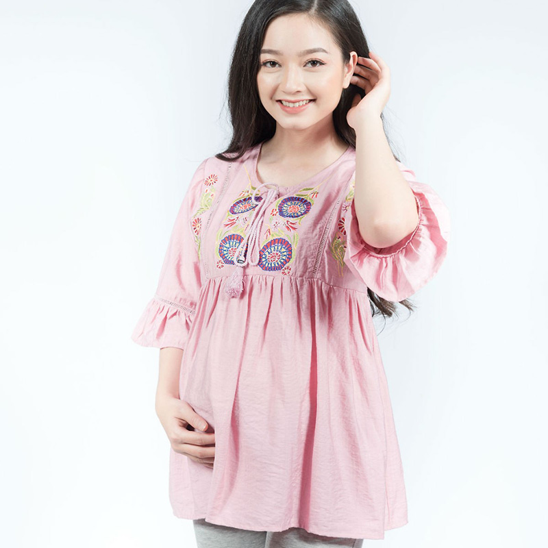 Áo bầu phối ren hồng có thiết kế rộng rãi phù hợp với mọi tư thế di chuyển của Mẹ