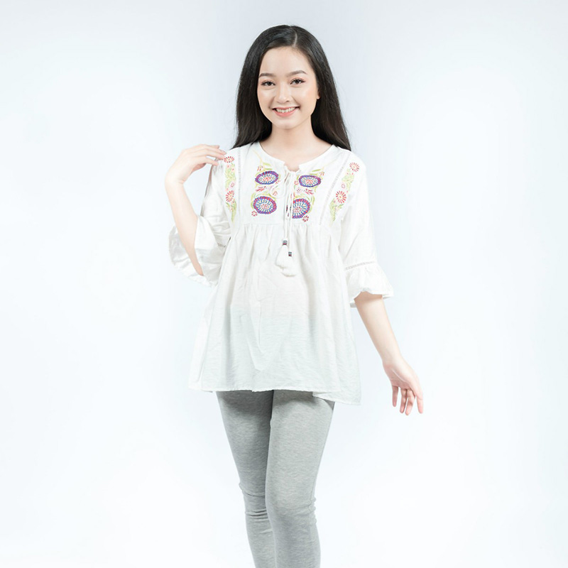 Áo bầu cổ xẻ thêu hoa tay bèo phối ren trắng Emum là một sản phẩm nằm trong bộ sưu tập thời trang đồ bầu xinh xắn và cá tính cho các mẹ được sản xuất và phân phối bởi hãng thời trang dành cho bà bầu Emum. Các sản phẩm đầm bầu Emum đều được làm bằng chất liệu vải nhập khẩu rất mềm mại không nhăn êm ái, đặc biệt rất mát mẻ khi mặc vào mùa hè
