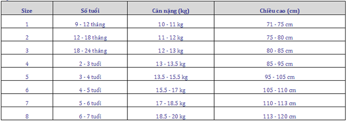 Bảng size cho bé (mẹ căn cứ vào chiều cao, cân nặng của bé để chọn size phù hợp)