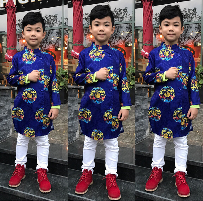 - Áo dài gấm bé trai không chỉ khiến các bé con trông vô cùng đáng yêu mà còn giúp tạo không khí tết truyền thống cho cả gia đình.