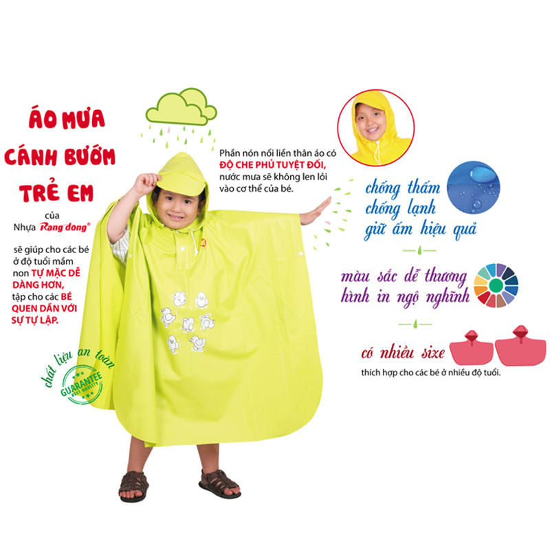Với những bé ở độ tuổi mầm non, Áo mưa cánh dơi Rạng Đông cho bé sẽ giúp cho các bé tự mặc dễ dàng hơn, tập cho các bé quen dần với sự tự lập. Áo mưa cánh bướm trẻ em có nhiều size và màu sắc để lựa chọn, thích hợp cho các bé ở những độ tuổi khác nhau.