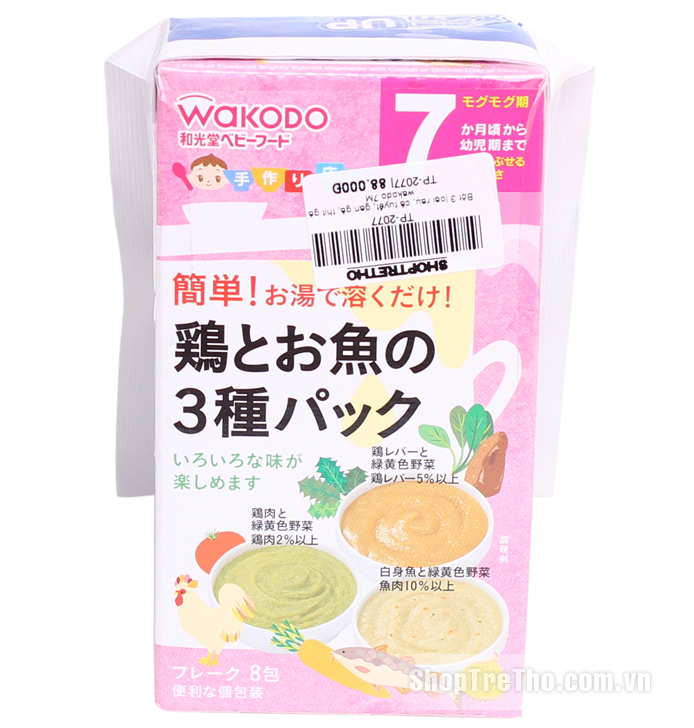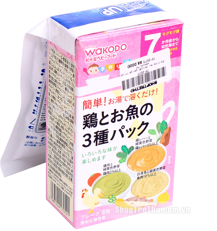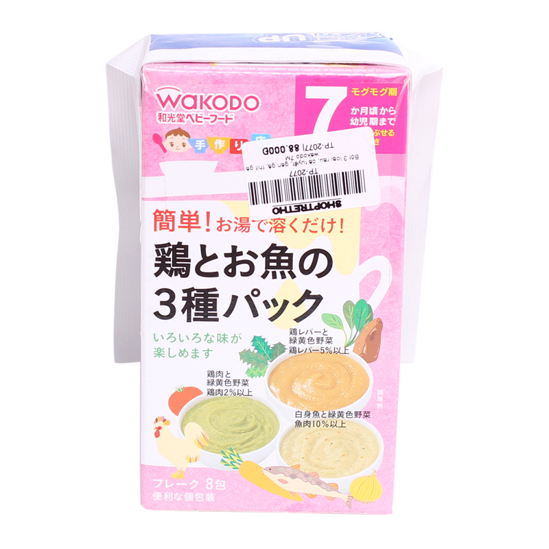 3 loại bột rau sáng màu với cá tuyết, gan gà, thịt gà Wakodo 7M. Một hộp sản phẩm bao gồm 3 gói bột ăn dặm ̣m từ thịt gà và rau sáng màu, 3 gói Bột ăn dặm từ gan gà và rau sáng màu, 2 gói Bột ăn dặm từ cá tuyết và rau sáng màu. Sản phẩm giúp bồi bổ cơ thể, cung cấp đầy đủ chất đạm, chất béo thực vật, tinh bột giúp trẻ phát triển toàn diện.
