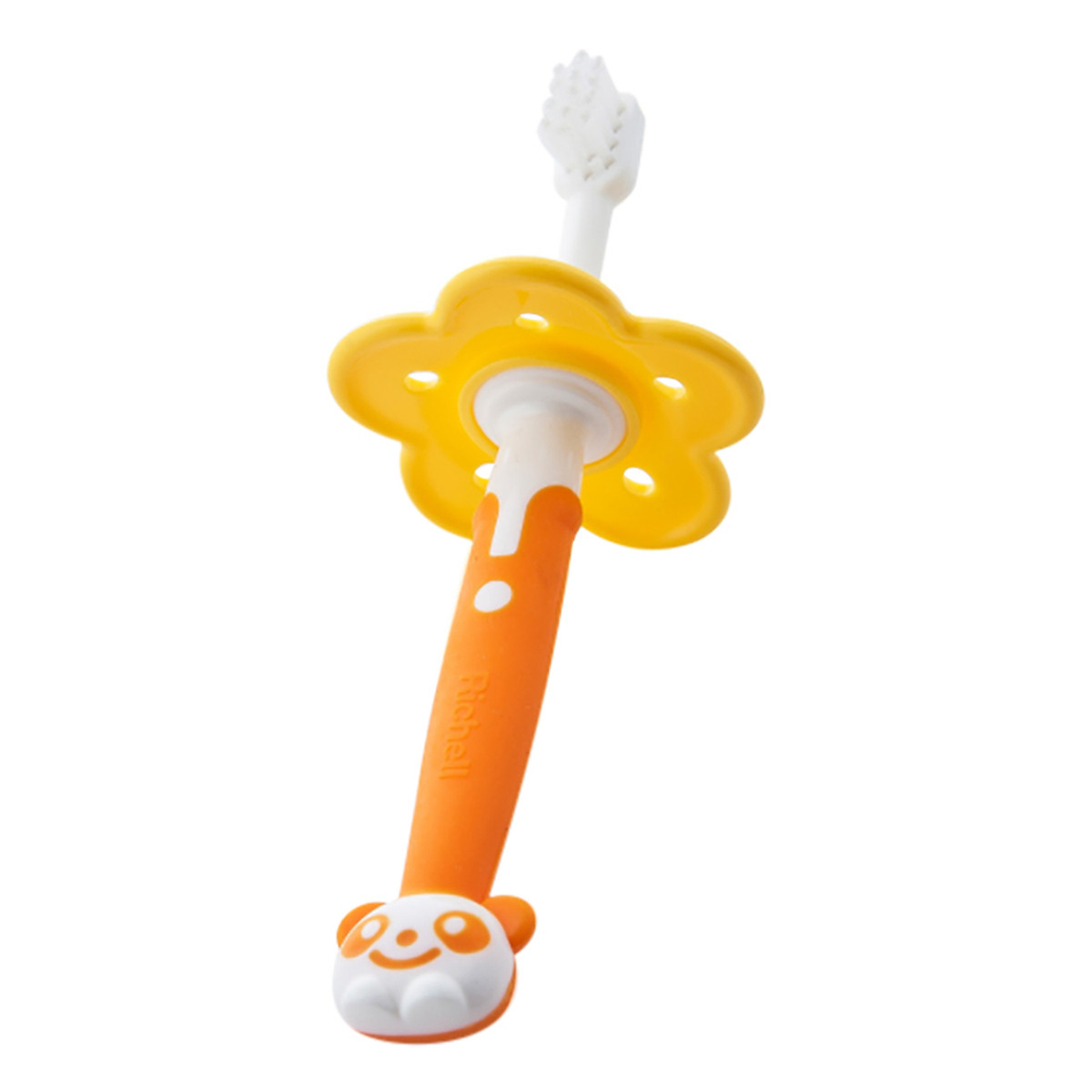 - Khiên bảo vệ màu vàng đi kèm, dùng để lắp vào bàn chải khi bé đánh răng, ngăn bàn chải vào sâu trong họng gây nguy hiểm cho bé.