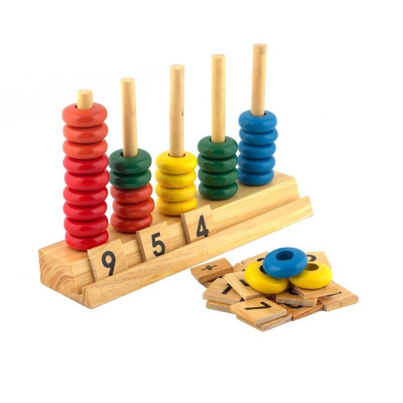 - Đồ chơi có 5 cọc, mỗi cọc có 6 vòng đếm, một bộ chữ số từ 0-9 và các dấu cộng, trừ, bằng, giúp bé biết cách phân biệt màu sắc, phép tính.