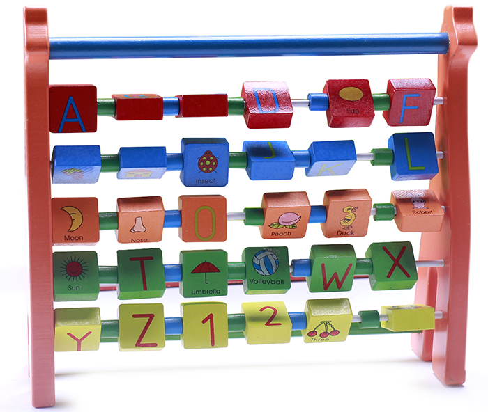Bàn tính hình chú hươu cao cổ liệt kê theo thứ tự toàn bộ chữ cái trong bảng chữ tiếng Anh và số từ 1-8 ở dạng chữ in hoa cùng với hình ảnh minh họa của chữ đó trong một từ tiếng Anh đơn giản và thông dụng.