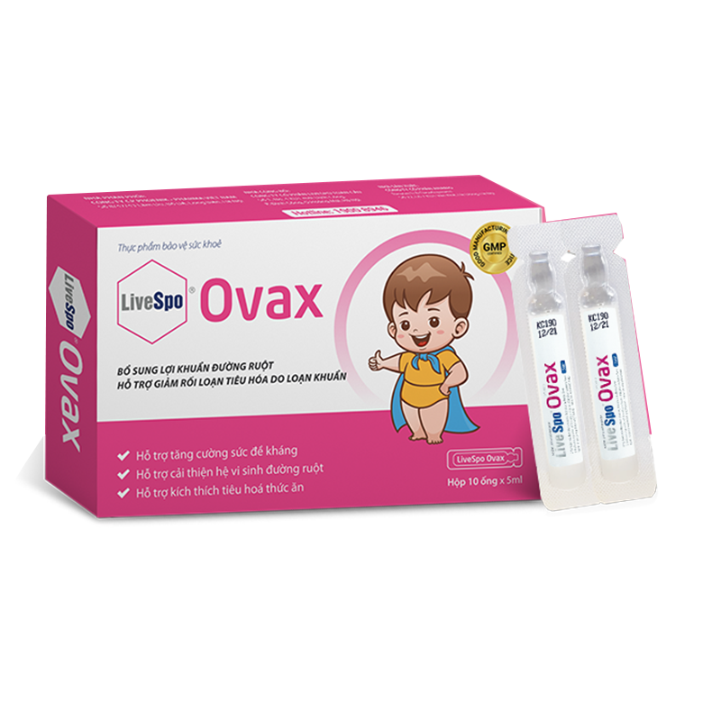 Bào tử lợi khuẩn OVAX (10 ống*5ml) là dòng sản phẩm ứng dụng công nghệ bào khuẩn Dr.ANH đặc biệt dành cho trẻ rối loạn tiêu hóa hay ốm vặt. Sản phẩm hỗ trợ bổ sung lợi khuẩn đường ruột, tăng cường sức đề kháng, giảm hiện tượng tiêu chảy, táo bón do loạn khuẩn, kích thích tiêu hóa, giúp trẻ ăn ngon miệng.