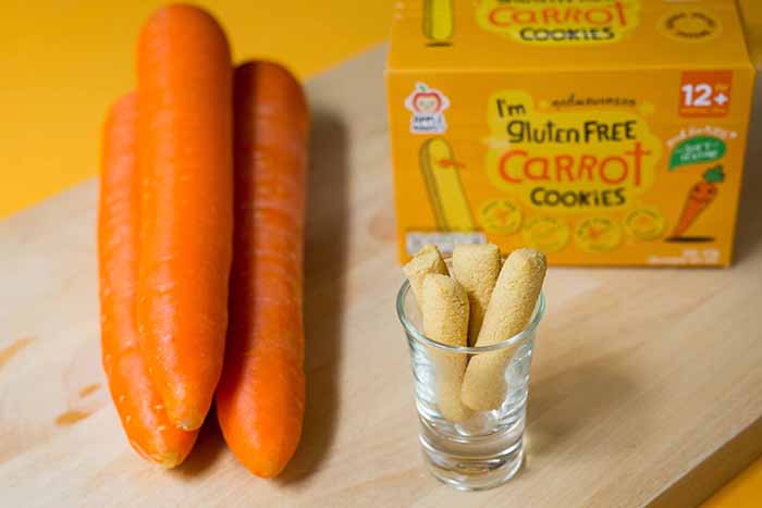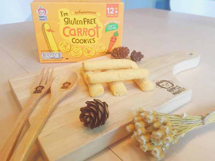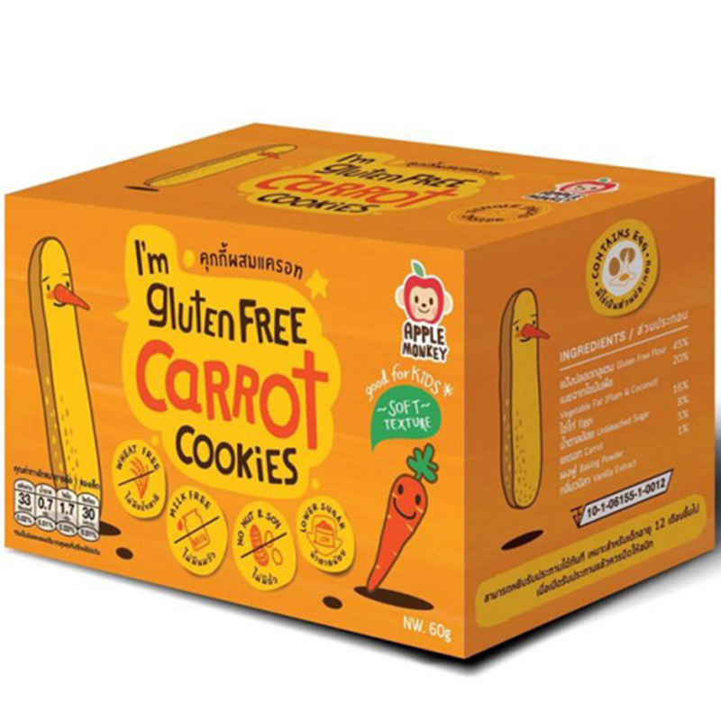 Bánh ăn dặm Apple Monkey vị cà rốt - Gluten free thích hợp cho bé từ 12 tháng tuổi – ít đường – không sữa – không đậu phộng – không đậu nành. Có bổ sung cà rốt. Bánh mềm và xốp, mùi thơm nhẹ nhàng của cà rốt.