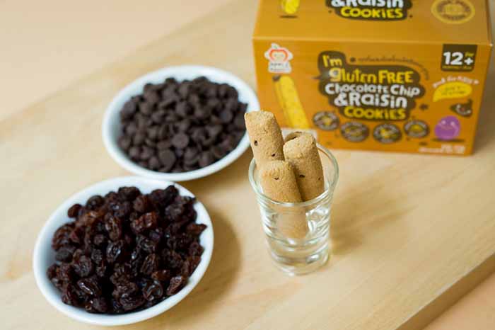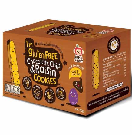 Bánh ăn dặm Apple Monkey vị sô cô la & nho khô - Gluten free thích hợp cho bé từ 12 tháng tuổi. Gluten free, ít đường, không sữa , không đậu phộng và không đậu nành. Có bổ sung hạt nhỏ của chocolate và nho khô