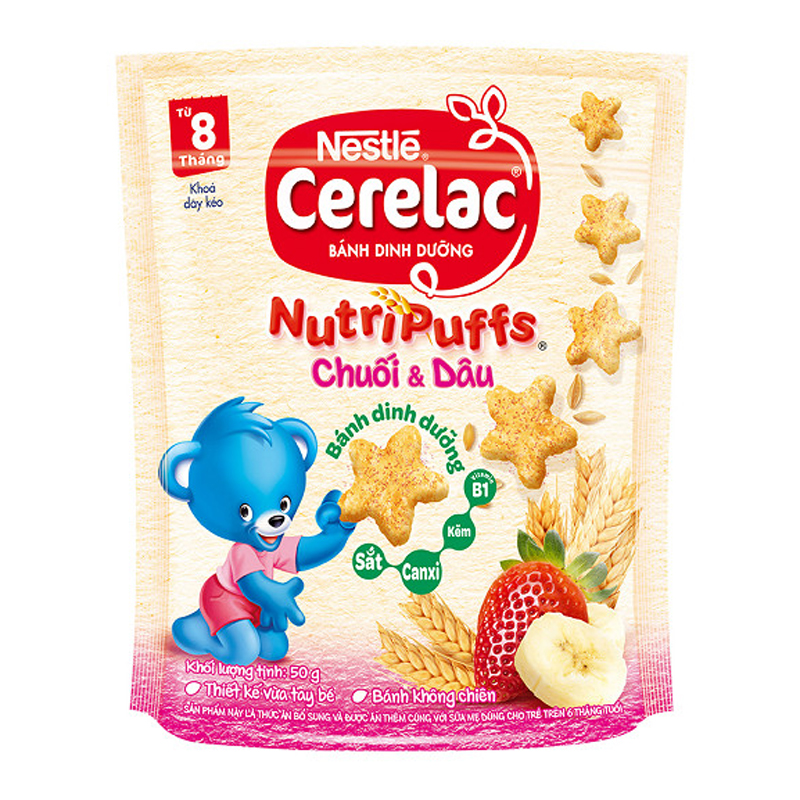 Bánh ăn dặm Nestlé Cerelac Nutripuffs vị chuối dâu (50g) làm từ dâu và chuối tự nhiên. Dâu là loại trái cây tuyệt hảo cung cấp nguồn vitamin dồi dào, đặc biệt là vitamin C giúp hỗ trợ sức đề kháng cho bé. Chuối giúp bé dễ tiêu hóa, dễ hấp thu và chứa nhiều chất xơ giúp ngăn ngừa táo bón.