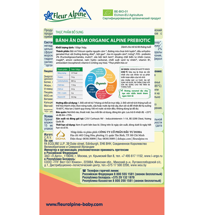 Bánh ăn dặm Organic Alpine Prebiotic là thực phẩm bổ sung hoàn toàn thiên nhiên dành cho bé từ 6 tháng trở lên. Hương vị thơm ngon đặc biệt nhờ thành phần tự nhiên được chọn lọc kỹ lưỡng: bột lúa mì nguyên hạt, đường mía, dầu thực vật… bánh ăn dặm Organic Alpine Prebiotic đáp ứng được các tiêu chuẩn khắt khe của châu Âu về thực phẩm Organic.