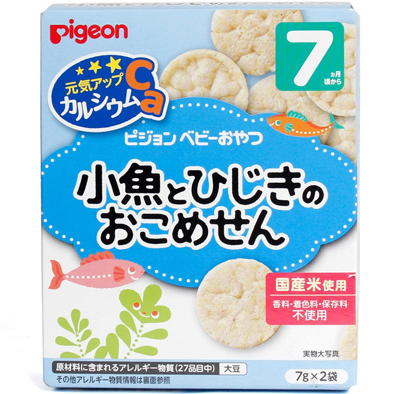 - Bánh ăn dặm Pigeon vị gạo, cá cơm, rong biển có thành phần nguyên liệu: Bột mì, đường, bột gạo, đường oligo, sữa đậu nành, bột cá cơm, rong biển xay, muối ăn, muối chứa nhiều Canxi