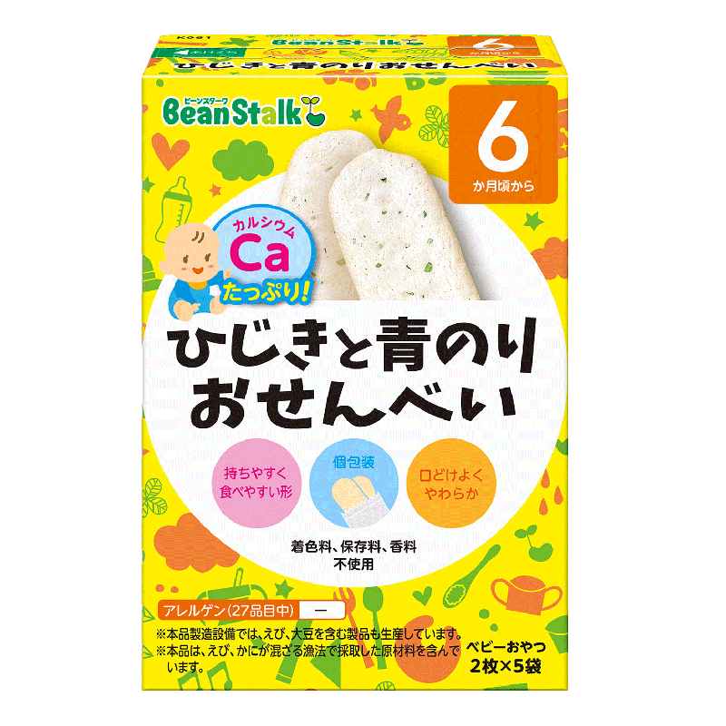 - Bánh ăn dặm BeanStalk được làm từ tảo Hijiki và tảo xanh, hỗ trợ bổ sung dinh dưỡng thiếu hụt hàng ngày như năng lượng, canxi, protein, chất béo… phù hợp giai đoạn trẻ ăn dặm hệ tiêu hóa non nớt của trẻ.
