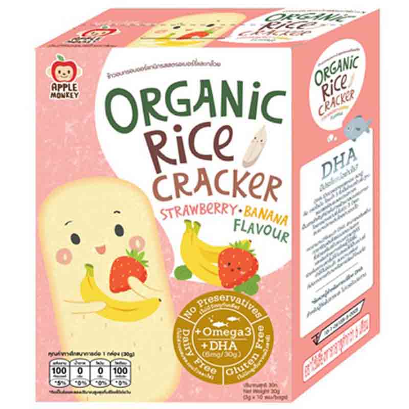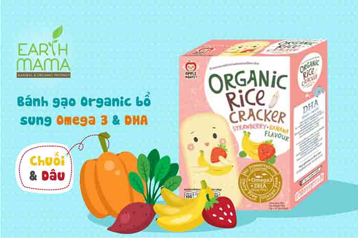 Bánh gạo organic vị chuối và dâu tây bổ sung Omega 3 và DHA giúp bé tập nhai, nuốt và phát triển răng, bổ sung Omega 3 và DHA để bé thông minh hơn.