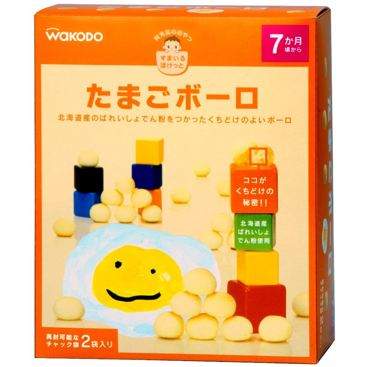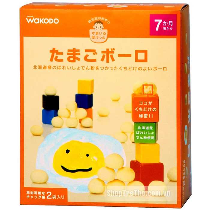 Bánh trứng Bolo Wakodo được làm từ trứng và tinh bột khoai tây Hokkaido, là thức ăn dặm cho bé từ 7 tháng tuổi trở lên. Bánh có hương vị thơm ngon, mát, ngọt dịu, bổ sung năng lượng cần thiết cho sự phát triển của trẻ. Bánh dạng viên, hình dáng nhỏ gọn dễ cầm, kích thích bé tự cầm khi ăn. Bánh được thiết kế với các “túi” (lỗ, nếp gấp, tầng khí) giúp nước bọt dễ thấm, làm bánh tan nhanh trong miệng bé. Đó chính là các “túi cười” Smile Pocket. Bánh không sử dụng chất tạo màu, chất bảo quản và hương liệu. Một hộp bánh gồm hai túi có khóa kéo, thuận tiện hơn khi bảo quản.