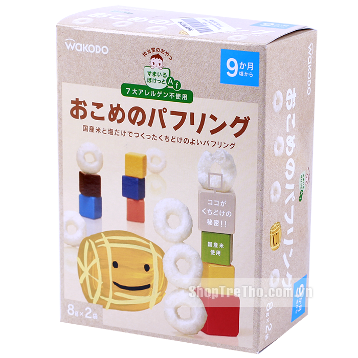 Bánh vòng cốm gạo Wakodo là loại bánh ăn dặm dành cho trẻ từ 9 tháng tuổi trở lên. Sản phẩm được làm từ gạo Nhật Bản đã được làm chín bằng cách hấp dưới áp suất cao, hạt gạo nở phồng khiến bánh xốp, nhiều túi khí. Cấu tạo đặc biệt khiến bánh mềm ra khi thấm nước bọt của trẻ, đảm bảo trẻ không bị hóc và giúp trẻ phát triển hệ cơ hàm. Bánh cung cấp các chất đạm, chất béo và năng lượng cần thiết cho trẻ giai đoạn mọc răng 9 tháng tuổi.