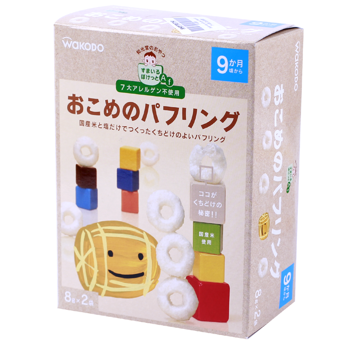Bánh vòng cốm gạo Wakodo dành cho các bé trong độ tuổi ăn dặm từ 9 tháng trở lên.
