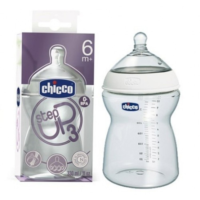 Bộ bình Chicco Step Up 6M+ 330ml gồm bình và núm ty chống đầy hơi 6M+ dành cho ăn đặc, thích hợp cho cả các thức ăn dạng lỏng khi bé bắt đầu chuyển qua giai đoạn ăn dặm.