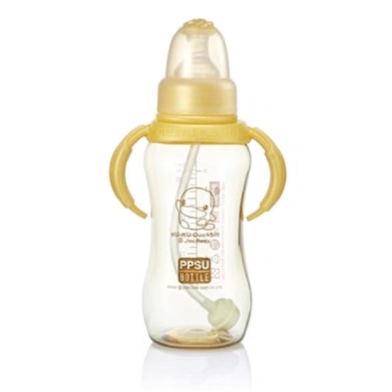 bình sữa PPSU cổ rộng 280ML - KU5844 có kiểu dáng đẹp và bền, nhờ thiết kế thắt lại ở giữa, thân bình sữa có tay cầm giúp bé có thể tự giữ chặt khi bú. Đồng thời bình cổ rộng nên thuận tiện cho việc pha sữa và súc rửa bình.