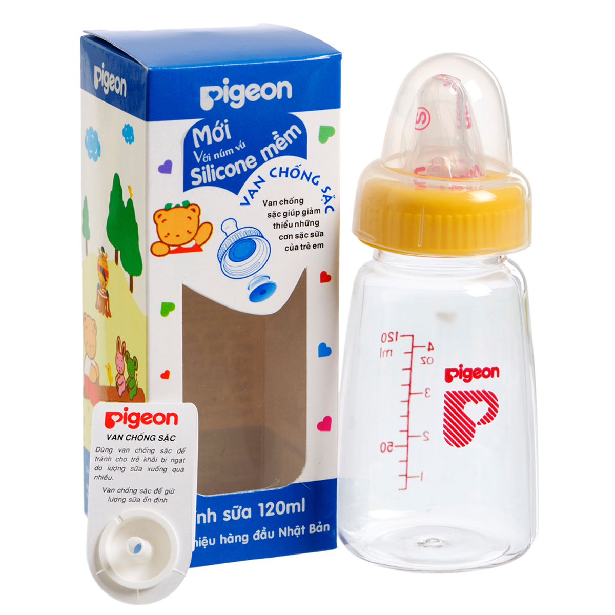 Bình sữa Pigeon Việt Nam 120ml cổ thường được thiết kế gọn, nhẹ và có hình con thú rất dễ thương và bắt mắt. Là sản phẩm an toàn, bình sữa Pigeon được nhiều mẹ cho bé nhà mình sử dụng bởi ưu điểm làm từ chất liệu an toàn, bền, chịu lực, chịu nhiệt tốt, có hệ thống van chống sặc và núm ty tốt, có khả năng điều chỉnh áp suất và lưu lượng của sữa.
