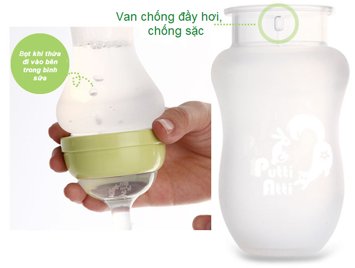 - Van khí được thiết kế trên cổ bình giúp hạn chế tối đa lượng không khí thừa đi vào bụng bé, từ đó ngăn chặn hiện tượng đầy hơi, chướng bụng, đau bụng,... thường gặp ở các bé bú bình thông thường.