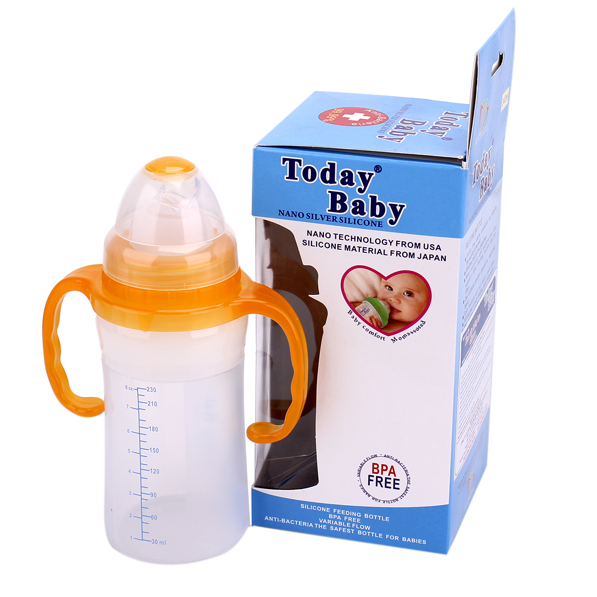bình sữa Today Baby cổ rộng 240ml (dẹt) với thiết kế độc đáo, cổ bình rộng, giúp cho việc bú bình của bé dễ dàng hơn. Công nghệ Nano silver có thể diệt được 99% vi khuẩn bám lại trên thành bình, có thể chịu nhiệt lên tới 300 độ C. Bình được làm từ nhựa cao cấp, không chứa BPA, đảm bảo an toàn cho bé. Núm ti của bình Today Baby được thiết kế giống như ti mẹ với van đóng mở tự động, với van đóng mở tự động không lo bé bị sặc sữa, ói sữa, đầy hơi...