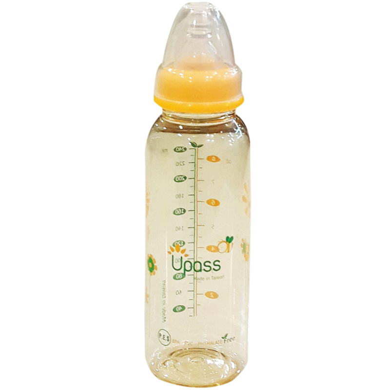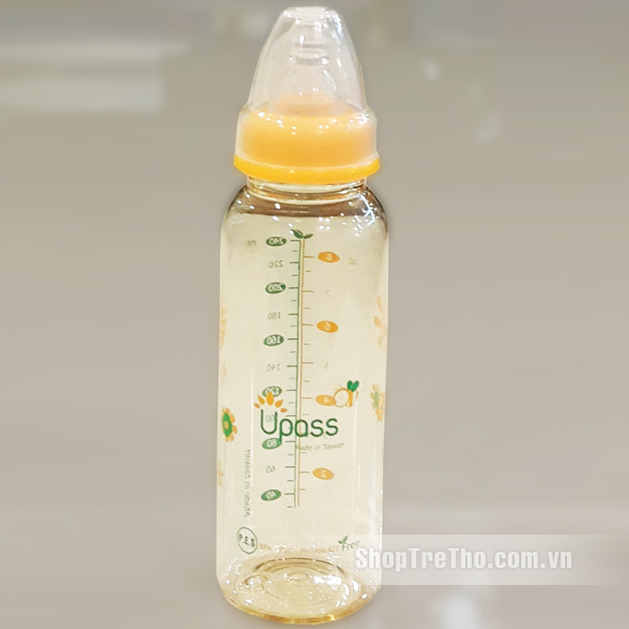 bình sữa PES cổ thường UPASS 240ml không BPA, có núm ti silicon siêu mềm chống sặc để đảm bảo an toàn cho bé. Với bé bú sữa công thức, hấp thu và dinh dưỡng chắc chắn là không bằng sữa mẹ, nên Tổ chức Y tế Thế giới WHO khuyến cáo mẹ nên cho bé uống theo liều lượng gợi ý của hãng sữa ghi trên vỏ hộp. Tuy nhiên dưới 06 tháng tuổi, lượng sữa bé ti mỗi cữ không nên quá 150ml, khi bé trên 6 tháng bé ti mỗi cữ khoảng 180ml và dần dần đến 12 tháng bé ti mỗi lần khoảng từ 200-250ml, vì thế sử dụng bình UPASS 240ml phù hợp cả khi bé đã lớn