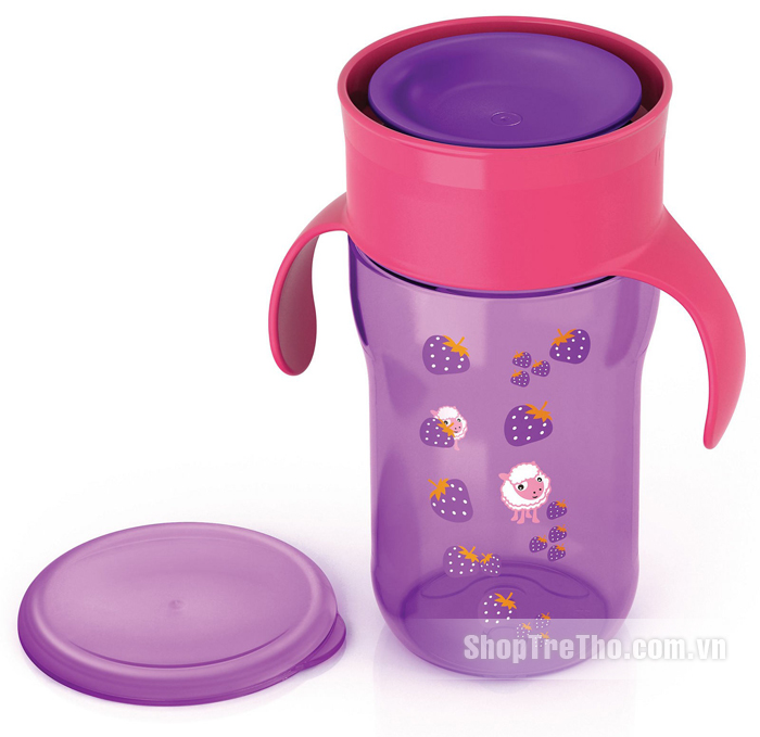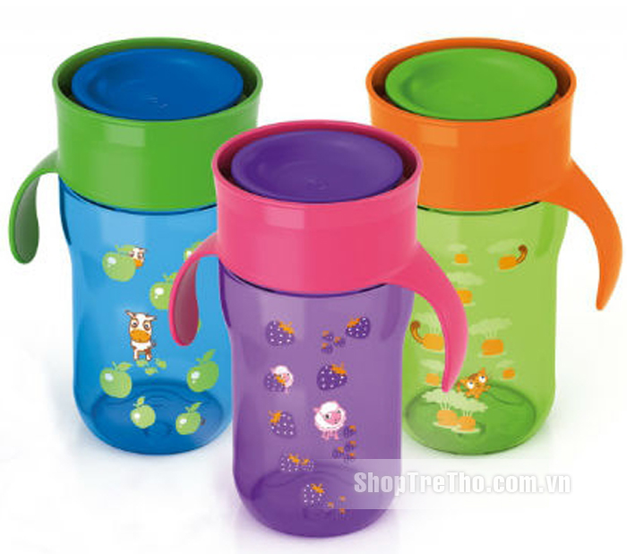 Bình tập uống avent 340ml 18M+ cho bé trên 18 tháng tuổi có van chống trào, ống hút mềm linh hoạt và kẹp giữ bình gắn bên hông, mẹ có thể treo bình tập uống avent 340ml trên xe đẩy hay kẹp vào thắt lưng rất tiện lợi.