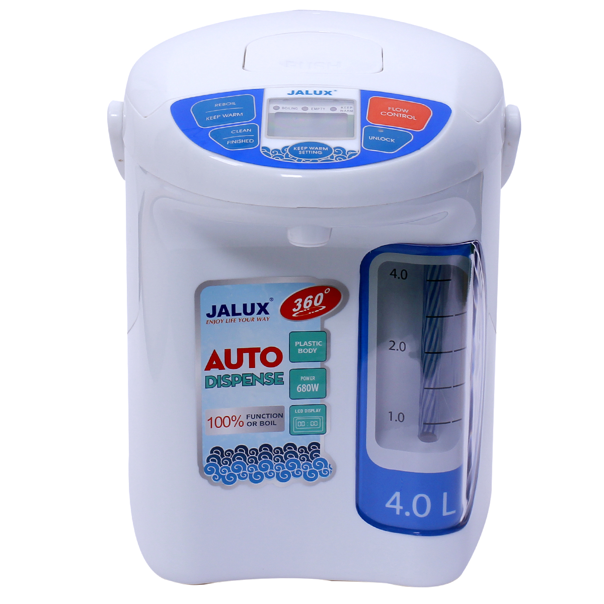 Bình thủy điện JALUX AP4.0L có công suất 680W, dung tích lớn tới 4 lít, thích hợp sử dụng cho văn phòng hoặc gia đình có nhu cầu sử dụng nhiều. Ngoài chức năng, tự động đun sôi, bình còn có khả năng giữ nhiệt độ ở 5 mức khác nhau, trang bị 3 hệ thống an toàn: khóa bơm tay, cảm biến chống quá nhiệt và chống cạn nước, nên bạn sẽ không lo các sự cố như nước sôi chảy ra ngoài gây phỏng.
