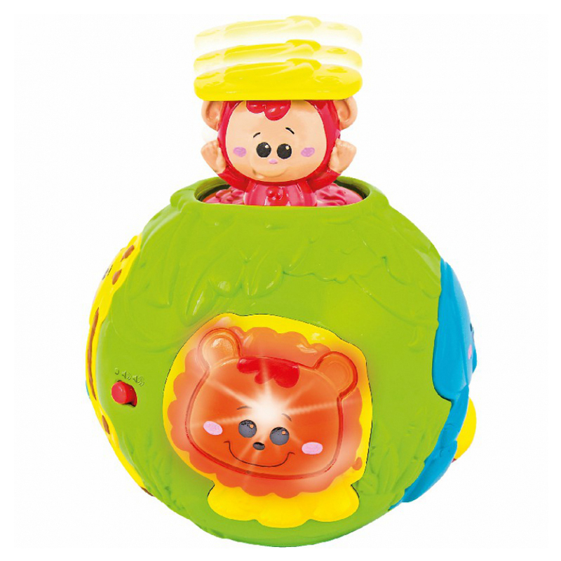- Trái bóng sẽ gây ra bất ngờ đầy vui thú cho bé bởi khi bé nhấn vào nút hình chú sư từ thì ở phía khác của trái bóng sẽ nảy lên một chú khỉ nhỏ vô cùng dễ thương. Với người bạn khỉ nhỏ bí mật này, bé có thể rèn luyện khả năng phản xạ nhanh cho mình
