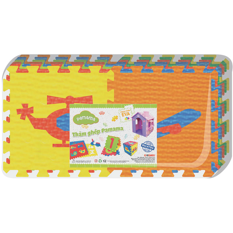 Thảm ghép hình với những màu sắc khác nhau giúp các bé vừa chơi vừa học cách nhận biết màu sắc và mặt số. Kích thước của 1 miếng là 32 x 32 cm. Tổng thể 10 miếng là 62 x 32 x 5 cm.