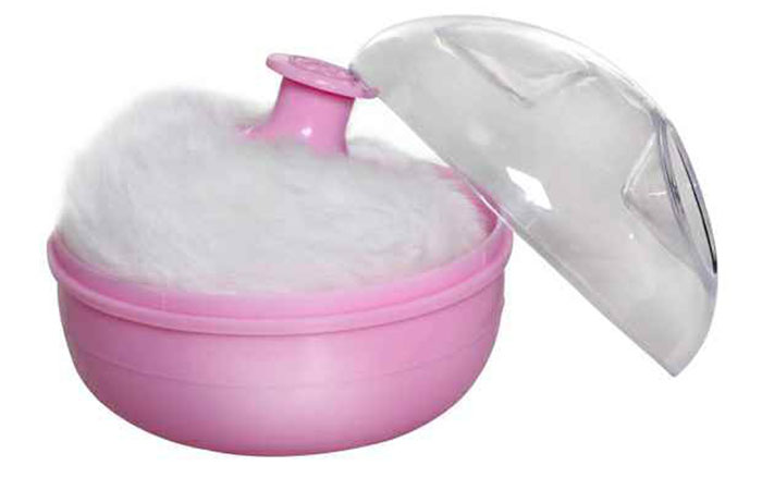 Dùng chấm phấn rôm cho bé. Mẹ chấm nhẹ bông vào phấn và chấm hoặc xoa vào người bé.