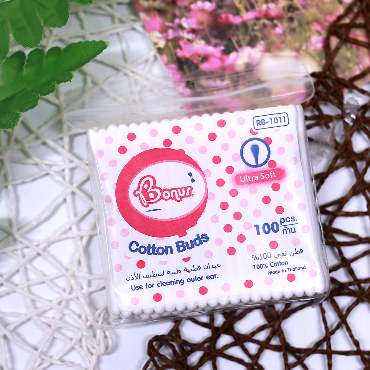 Bông tăm Bonus RB-1011 (100 cây/gói) làm từ 100% Cotton kèm theo đó là thân cây được làm từ nhựa giúp các mẹ dễ dàng vệ sinh tai, mũi cũng như sử dụng để lau kẻ mắt khi trang điểm. Sản phẩm là hàng cao cấp của Thái Lan nên mẹ hoàn toàn yên tâm về xuất xứ, chất lượng sản phẩm.