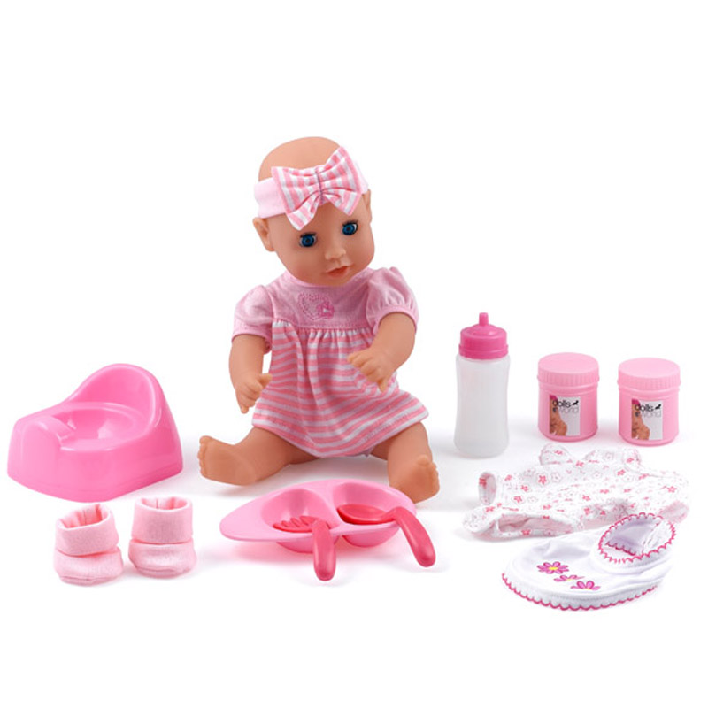 Với em búp bê xinh xắn này bé có thể chơi các trò chơi cho búp bê ăn, uống sữa và đi vệ sinh bằng bô đấy nhé!