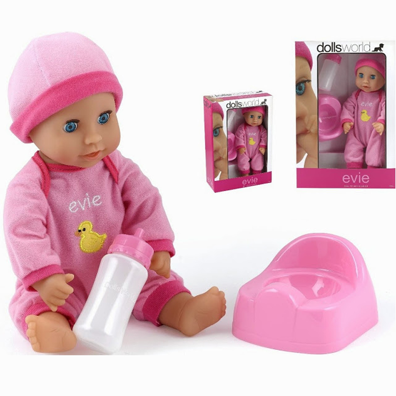Bộ đồ chơi búp bê Dolls World - Em bé Evie dành cho trẻ từ 18 tháng tuổi trở lên, có kích thước 30 cm vừa tay ôm, được làm từ chất liệu nhựa cao cấp, an toàn. Sản phẩm có kèm theo bộ trang phục màu hồng kẻ, chiếc mũ xinh xắn, một chiếc bình sữa và một chiếc bô hồng để con yêu chơi trò bán hàng, tập làm người lớn chăm sóc cho bé Evie. Bé hãy cho Evie uống sữa rồi cho búp bê đi vệ sinh như mẹ làm với mình nhé, qua đó mẹ sẽ thấy con yêu của mình hình thành các nhân cách, phản xạ, khả năng tư duy, tính độc lập ngay từ khi còn bé.