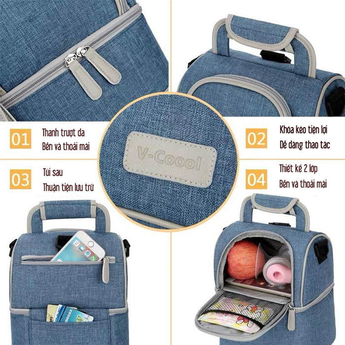 - Túi đựng đồ V-Coool đi kèm quai đeo chắc chắn, với các chốt móc thông minh, giúp bố mẹ có thể đeo thành dạng túi chéo/đeo vai hoặc chuyển đổi thành ba lô đeo 2 vai trên lưng thuận tiện.