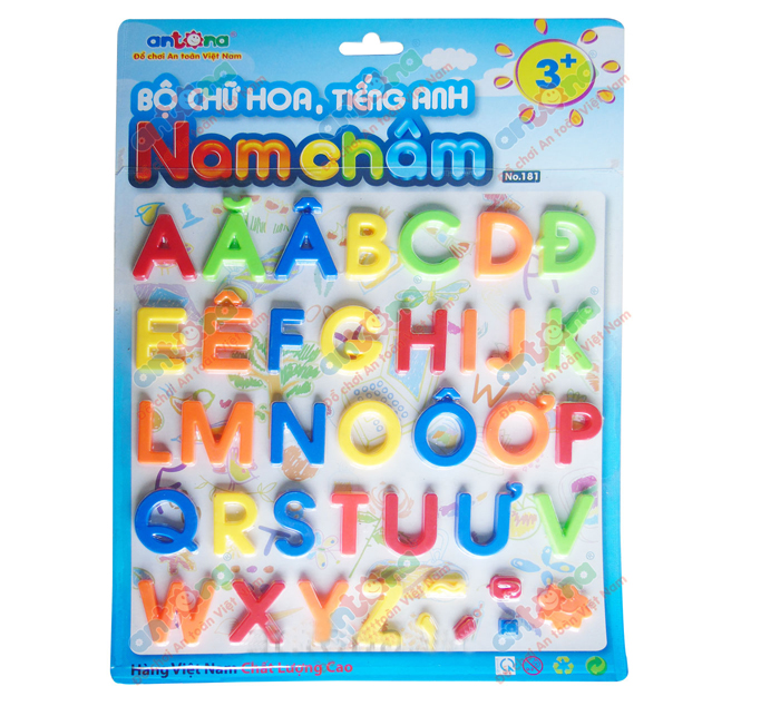 Bảng chữ cái nam châm Antona No.181 gồm 34 chữ cái (trong đó có 29 chữ cái tiếng việt và thêm 5 chữ cái tiếng anh) và 5 thanh dấu, được làm từ chất liệu nhựa an toàn có gắn nam châm. Bé có thể học và chơi bằng việc xếp các chữ cái, thanh dấu và tập ghép vần lên bàn, lên bảng nam châm, lên tủ lạnh.... Với bộ chữ cái chuẩn theo phông chữ của bộ giáo dục, các bé sẽ học tất cả những kiến thức và kỹ năng cơ bản cần thiết nhất trước khi tới trường.