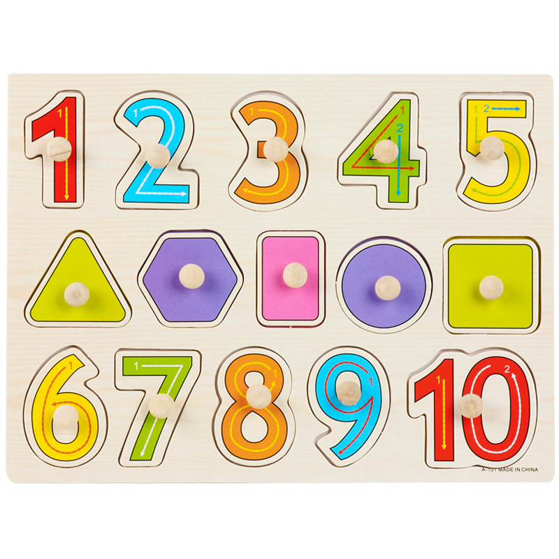 - Bảng số và hình học gồm một bảng gỗ và 10 mảnh ghép chữ số cùng với 5 mảnh ghép hình học, sau mỗi mảnh ghép là là hình của những loại hoa quả và từ tiếng anh. Các mảnh ghép đều có gắn núm cầm tay giúp các bé nhỏ dễ thao tác.