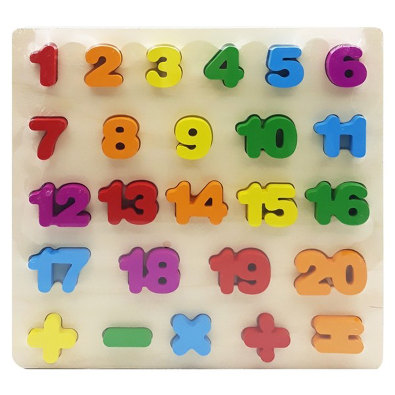 - Sản phẩm gồm một bảng gỗ cùng với 20 mảnh ghép chữ số và các dấu cộng, trừ, nhân, chia, dấu bằng, kiểu dáng đẹp, màu sắc bắt mắt.