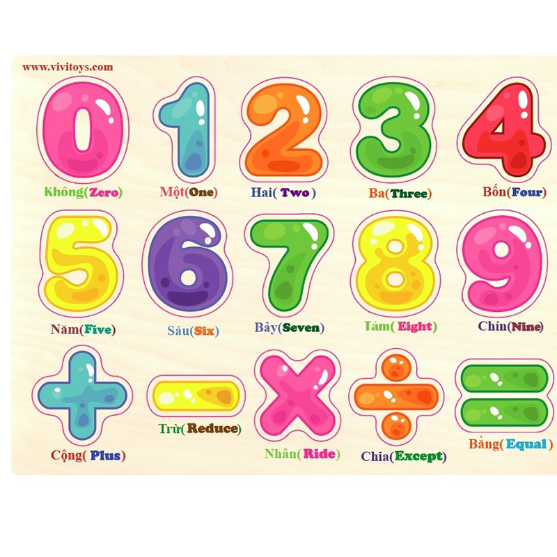 Bảng song ngữ 10 con số có núm gỗ Vivitoys 749 gồm 10 số từ 0 đến 9 và phép tính cơ bản, đươc làm từ chất liệu gỗ an toàn, mỗi số lại có màu sắc khác nhau, qua đó giúp bé nhận diện và biết cách đọc các số cơ bản cũng như nhận diện màu sắc. Sản phẩm là món đồ chơi giáo dục dành cho bé từ 3 tuổi trở lên.