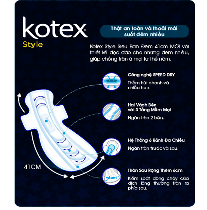 Băng vệ sinh ban đêm Kotex Style siêu mỏng có cánh 41cm(3 miếng) được thiết kế cho những đêm nhiều với hệ thống 6 rãnh đa chiều giúp ngăn tràn trước và sau, vừa vặn và ôm sát toàn bộ cơ thể, giúp chống tràn ở mọi tư thế nằm, đem lại cho bạn một giấc ngủ trọn vẹn trong những đêm ngày ấy.