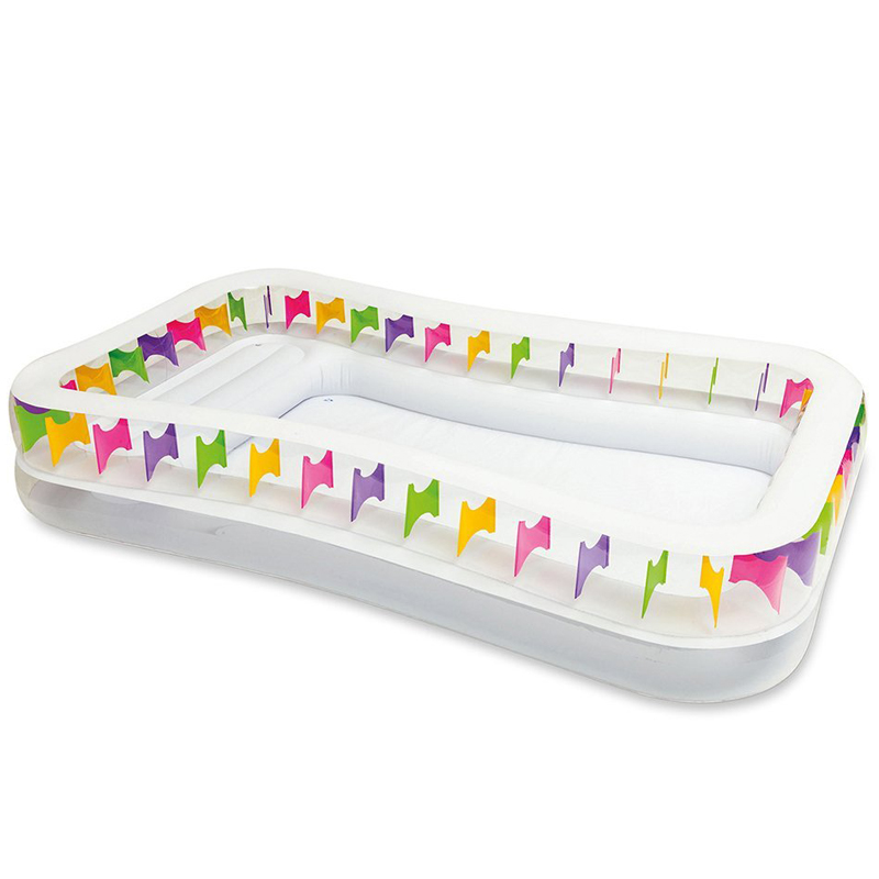 Đặc điểm: Bể bơi sắc màu trong suốt hình chữ nhật intex 57477 - Colors of Summer hình chữ nhật, sau khi bơm có kích thước Dài 2m95, Rộng 1m75, Cao 53 cm. Thành bể trong suốt với các miếng màu sắc trang trí bên trong