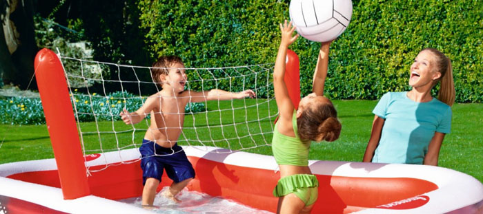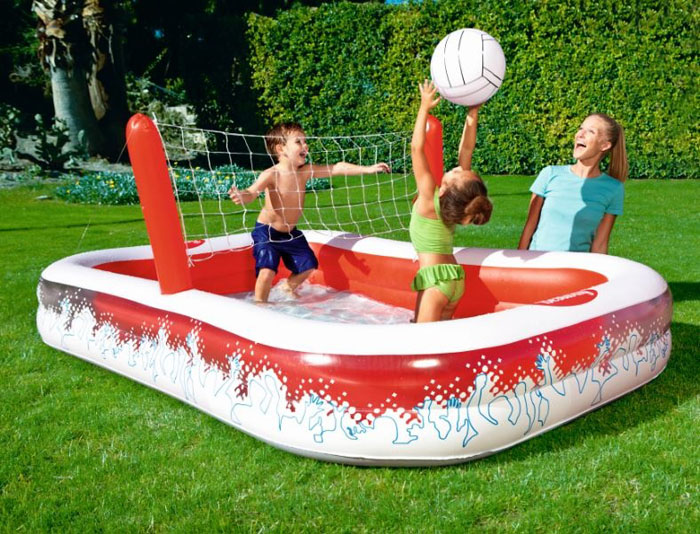 - Thiết kế có kèm lưới đánh bóng chuyền đặt ở giữa kèm 1 quả bóng chuyền nước loại nhẹ, để các bé có thể chơi thể thao với nhau