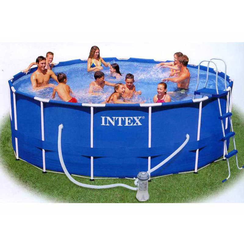 Bể bơi tròn cho bé Intex khung kim loại sau khi lắp ráp kích thước 15 ft x 42 inch 4m57 x 107cm, dễ dàng lắp ráp chỉ sau 45 phút có thể sẵn sàng sử dụng, bao gồm thang, vải mặt đất, bạt che bể, bộ bảo trì và bảo vệ xung quanh