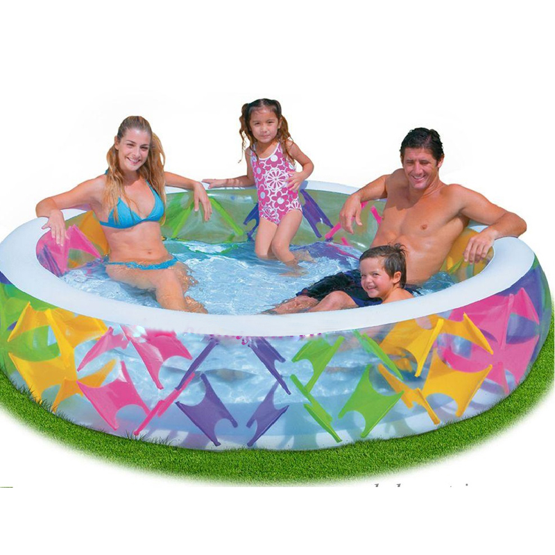 Bể bơi phao gia đình tròn sắc màu sau khi bơm có đường kính 2m29, cao 56 cm, thành bể trang trí sắc màu độc đáo.