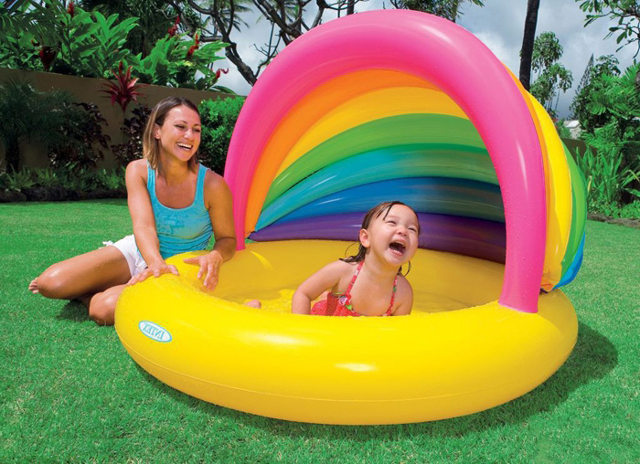 Đặc điểm : Bể bơi phao INTEX mái che cầu vồng đáy bể có bơm hơi tạo cảm giác êm ái cho bé khi sử dụng