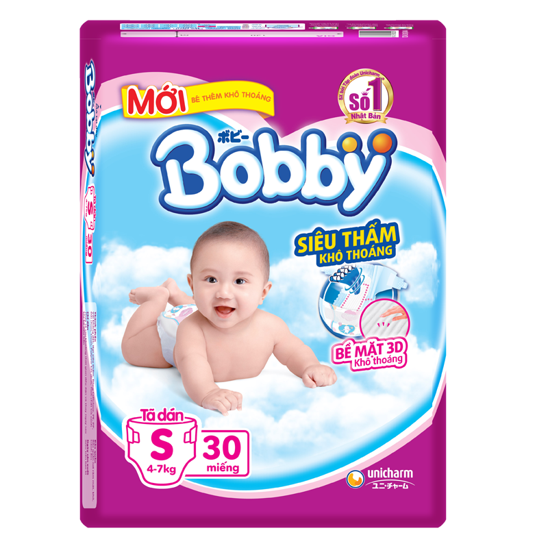 Bỉm dán Bobby S30, S32 (siêu mỏng) mới với lớp thấm nhanh siêu tốc, thấm hút thật nhanh, cho bé thoải mái khô thoáng suốt đêm. Bố mẹ yên tâm bé yêu được chăm sóc tốt nhất với tã giấy Bobby. Sản phẩm dành cho bé dưới 7kg.