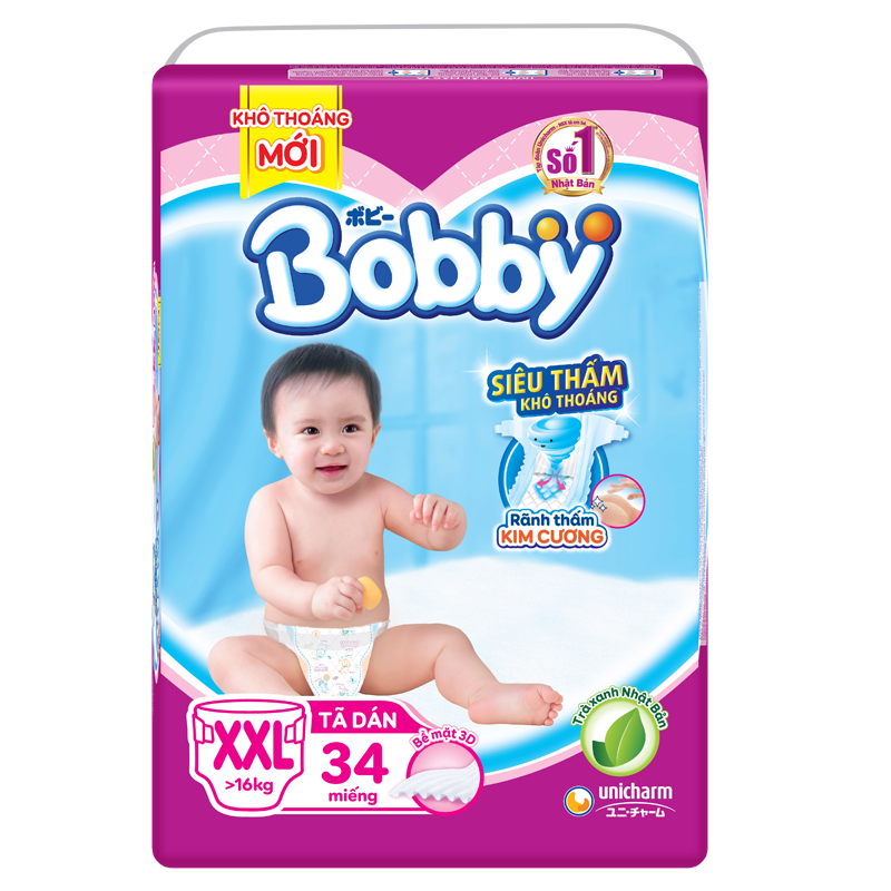 Tã dán Bobby XXL34 lần đầu tiên áp dụng công nghệ RÃNH THẤM KIM CƯƠNG đột phá, nâng cao khả năng thấm hút, cho bé luôn khô thoáng. Được làm hoàn toàn bằng chất liệu cao cấp và thiết kế siêu mỏng, tã giấy siêu mỏng Bobby xxl34 sẽ phù hợp cho con bạn sử dụng vào ban ngày hay những khi thời tiết nóng ẩm.