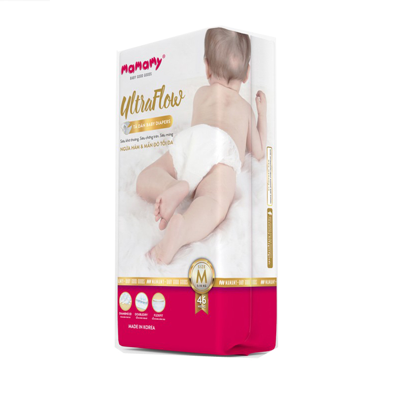 Bỉm tã dán Ultraflow Mamamy M46 được sản xuất bởi công nghệ tiên tiến của Hàn Quốc kết hợp với các loại nguyên liệu cao cấp, cải tiến cao hơn nữa để tạo sự nhẹ nhàng, khô thoáng và thấm hút nhất. Đặc biệt, để bé yêu luôn khỏe mạnh, Mamamy đã nghiên cứu và áp dụng 3 cải tiến ưu việt, đồng thời với 3 cấu tạo ưu việt để giúp bé ngừa hăm và mẩn đỏ tối đa nhất.